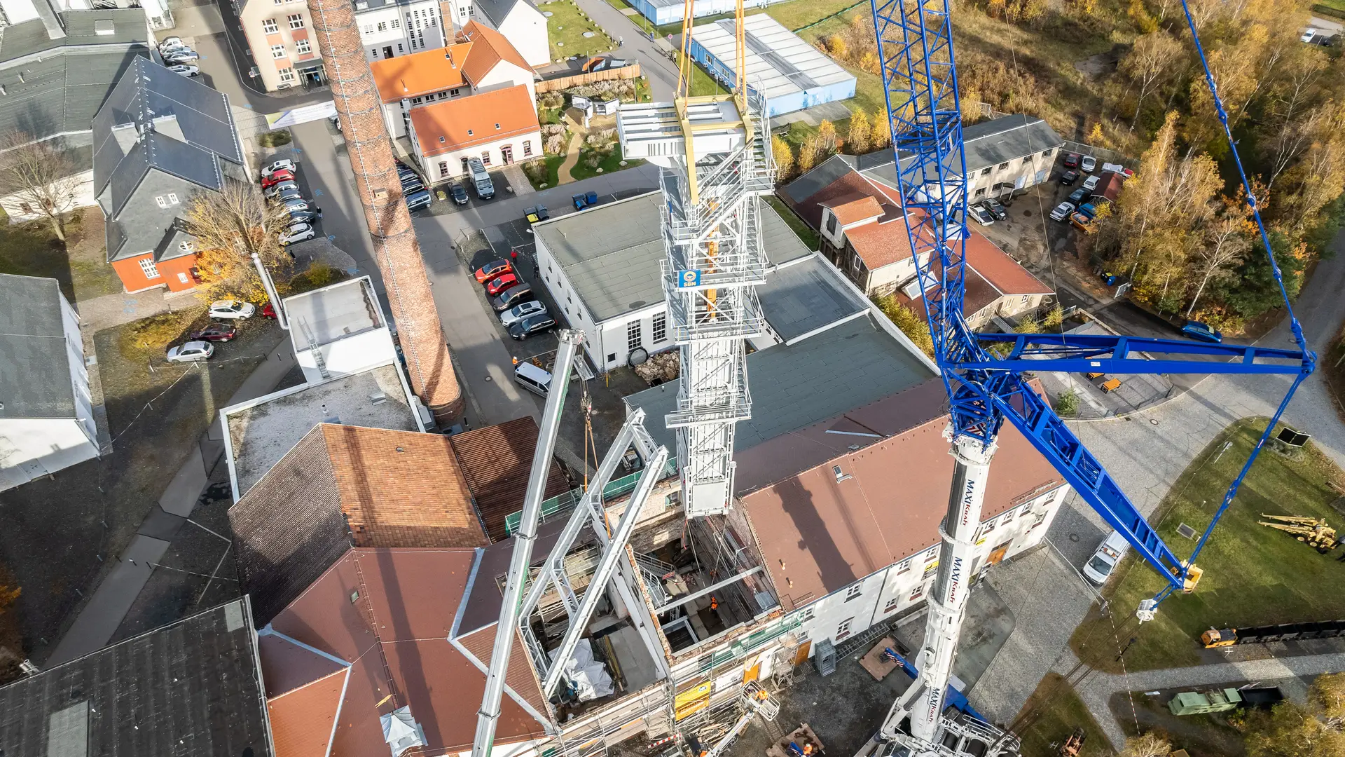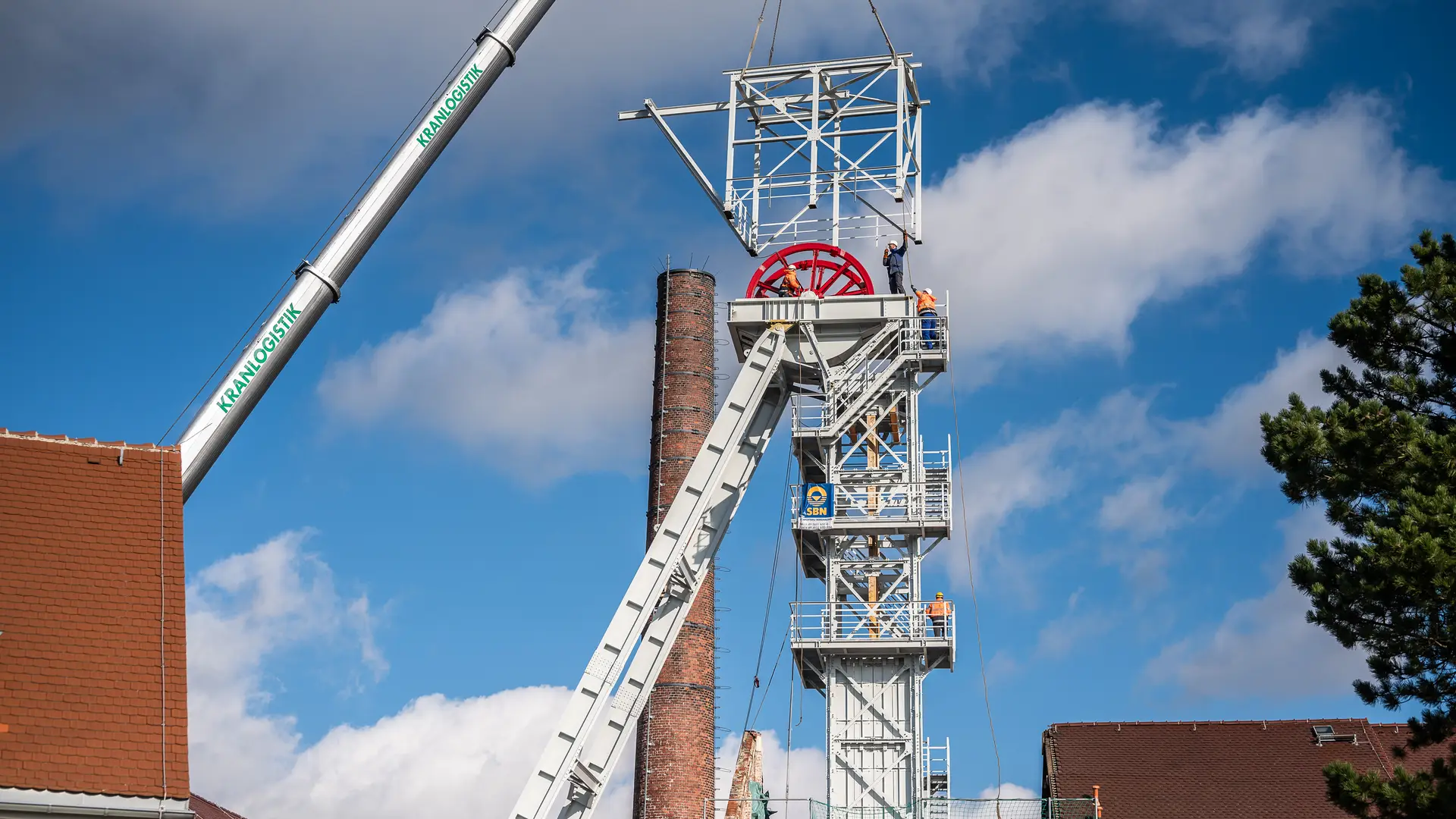 Die SCHACHTBAU NORDHAUSEN Stahlbau GmbH fertigte nicht nur das rund 34 Tonnen schwere Fördergerüst, sondern auch die Schachtträger, Seilscheibenbühne und Begehanlagen. Mehr als 4.500 Schrauben halten das imposante Bauwerk zusammen. Jede einzelne wurde per Hand vorbehandelt, ehe der gesamte Stahlbau mit Korrosionsschutz versehen wurde. Der aufwendige Einbau der Stahlkonstruktionen vor Ort in Freiberg, inklusive der neuen Schachtträger mit einem Einzelgewicht von 6,5 Tonnen, wurde mit modernster Krantechnologie realisiert.