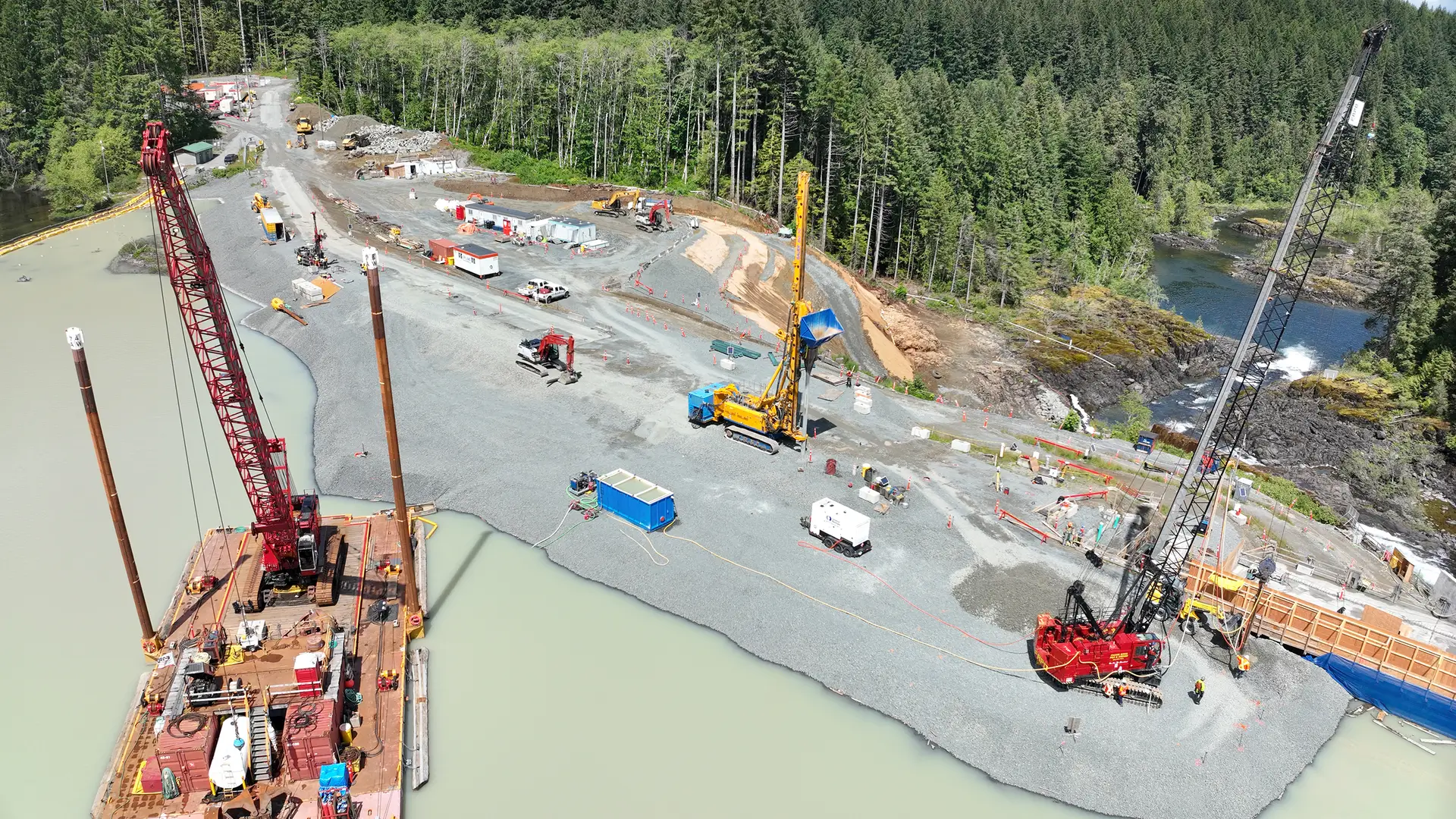 The project, which is managed by Aecon/EBC General Partnership (AEGP), includes constructing a low permeability plastic concrete cut-off wall on the Middle Earth-fill Dam to improve the water barriers and seismic performance of the earth-fill section. This work was crucial in order to increase the dam’s seismic resistance and minimize the risk of floods and other damage to the public. In addition to the cut-off wall works, Bauer performed soil improvement on the soft sediments to reinforce the North Earth-fill Dam. Bauer’s construction tasks included installation of the plastic concrete cutoff wall as well as land and marine densification for the new upgraded earth-fill berms. The major challenge: Minimizing the environmental impact to the reservoir, Campbell River and surrounding park during construction, particularly close to the drinking water extraction point for Campbell River. The work began in October 2023 and was successfully completed in July 2024. Another phase of soil improvement will follow in 2025.