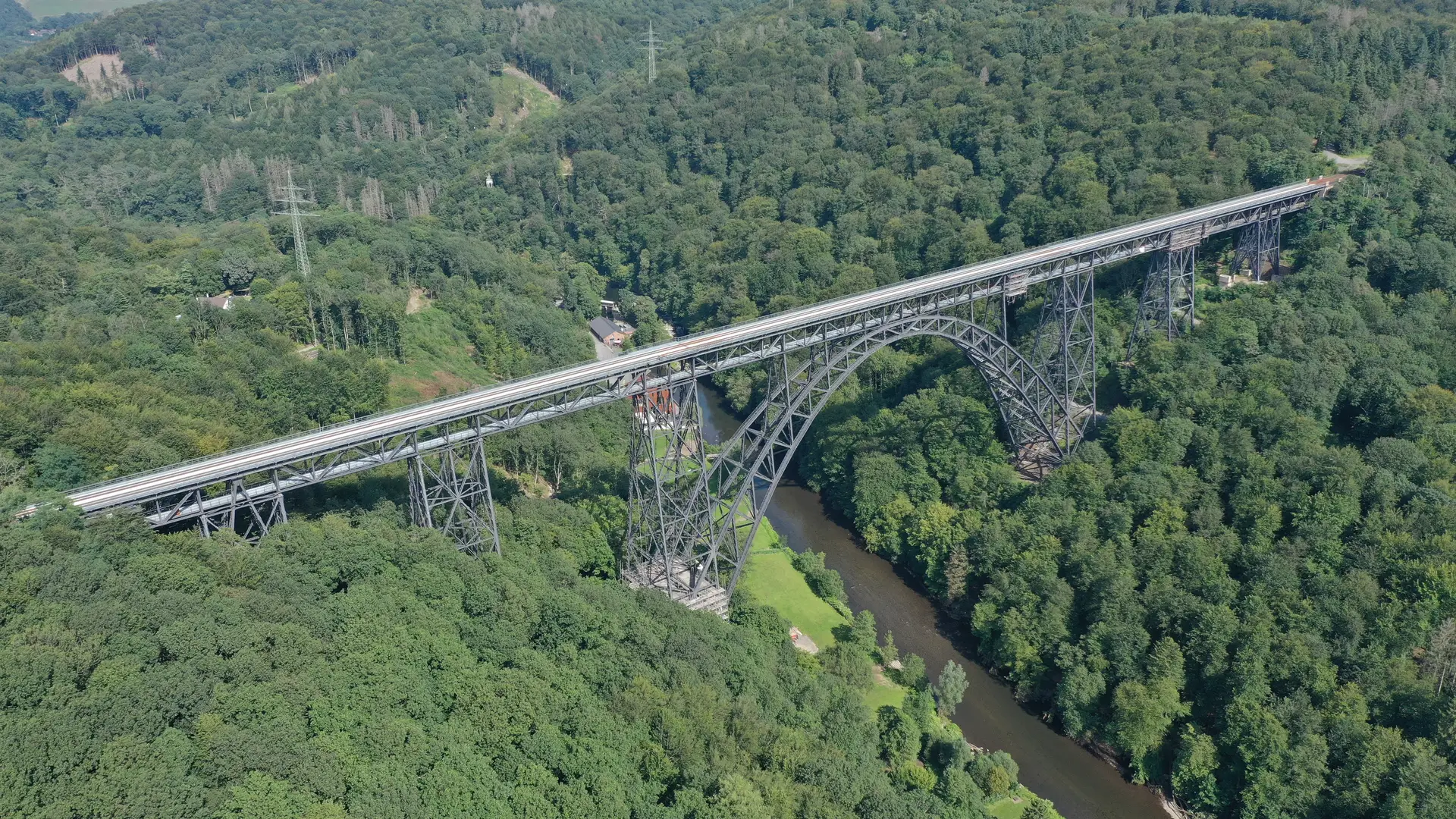 Deutschlands höchste Eisenbahnbrücke führt in 107 m Höhe Züge zwischen Solingen und Remscheid über die Wupper. Von 2014 bis 2022 setzten die Schachtbauer im Rahmen einer ARGE das denkmalgeschützte Bauwerk aus dem Jahr 1897 unterhalb der ca. einen Meter hohen Fahrbahn stahlbautechnisch komplett instand.