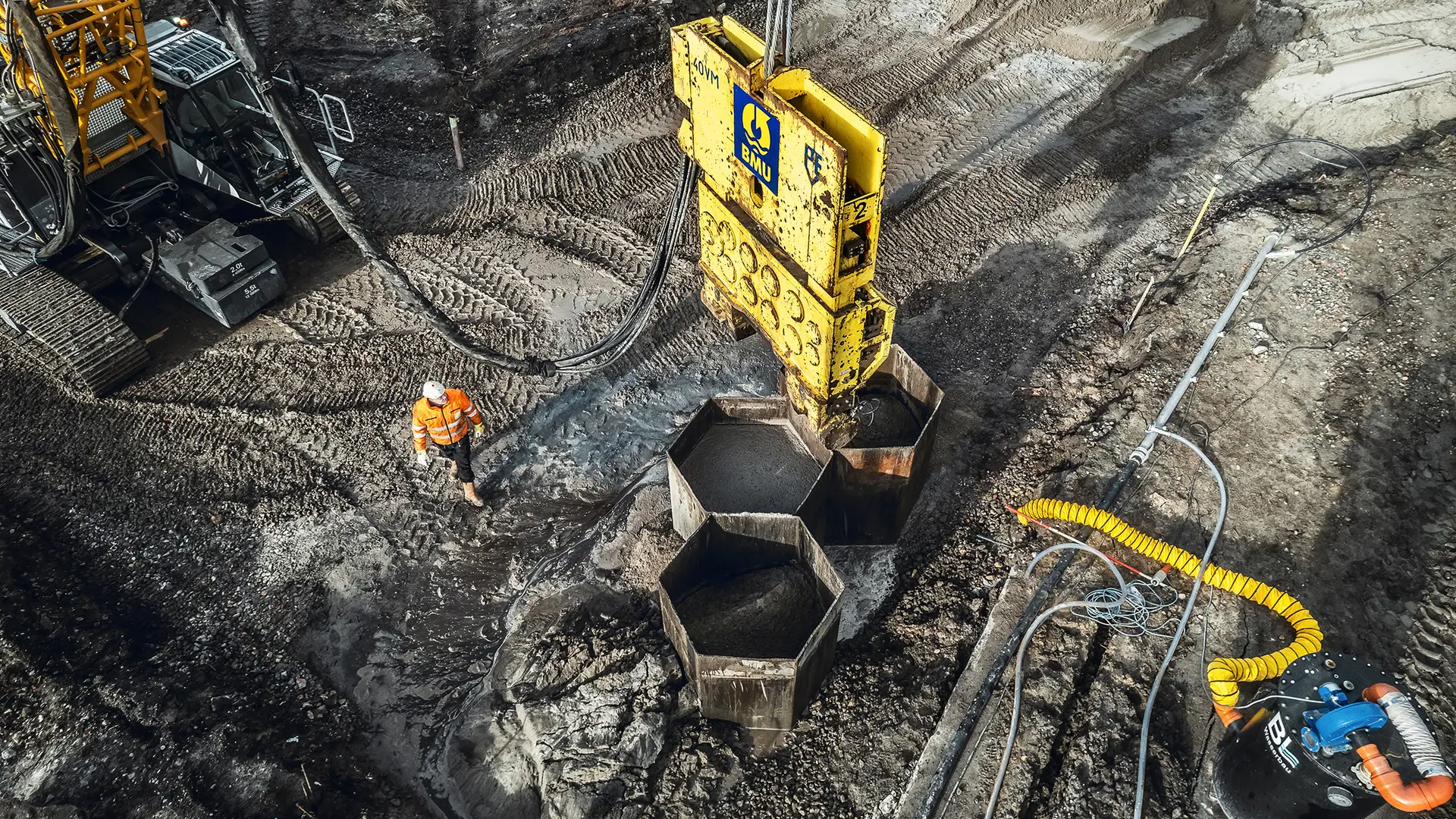 In November 2023, the Bauer Resources specialists got the green light. "We approach a project like this one very systematically", says Friedrich Leifheit. It all starts with the preparatory works and the creation of the infrastructure for the construction site. "After all, good preparation and design are the key success factors", the experienced project manager in the environmental division at BAUER Resources GmbH continues to explain. The next step is the replacement of more than 2,000 m3 of soil using the honeycomb method. As part of this process, hexagonal steel elements are inserted in a honeycomb structure using a high-frequency vibrator attached to a duty-cycle crane. Afterwards, the honeycombs are dug out using a special excavator. The method has several advantages, as Holm Uhlig, a sales representative at Bauer Umwelt, the environmental division of BAUER Resources GmbH, knows from many years of experience as a project manager: "On the one hand, the honeycombs make it possible to excavate large areas efficiently and evenly, allowing the thorough removal of the contaminated material. On the other hand, the hexagonal cross-section of the honeycombs prevents possible gaps and any resulting penetration of contaminants into the surrounding soil."