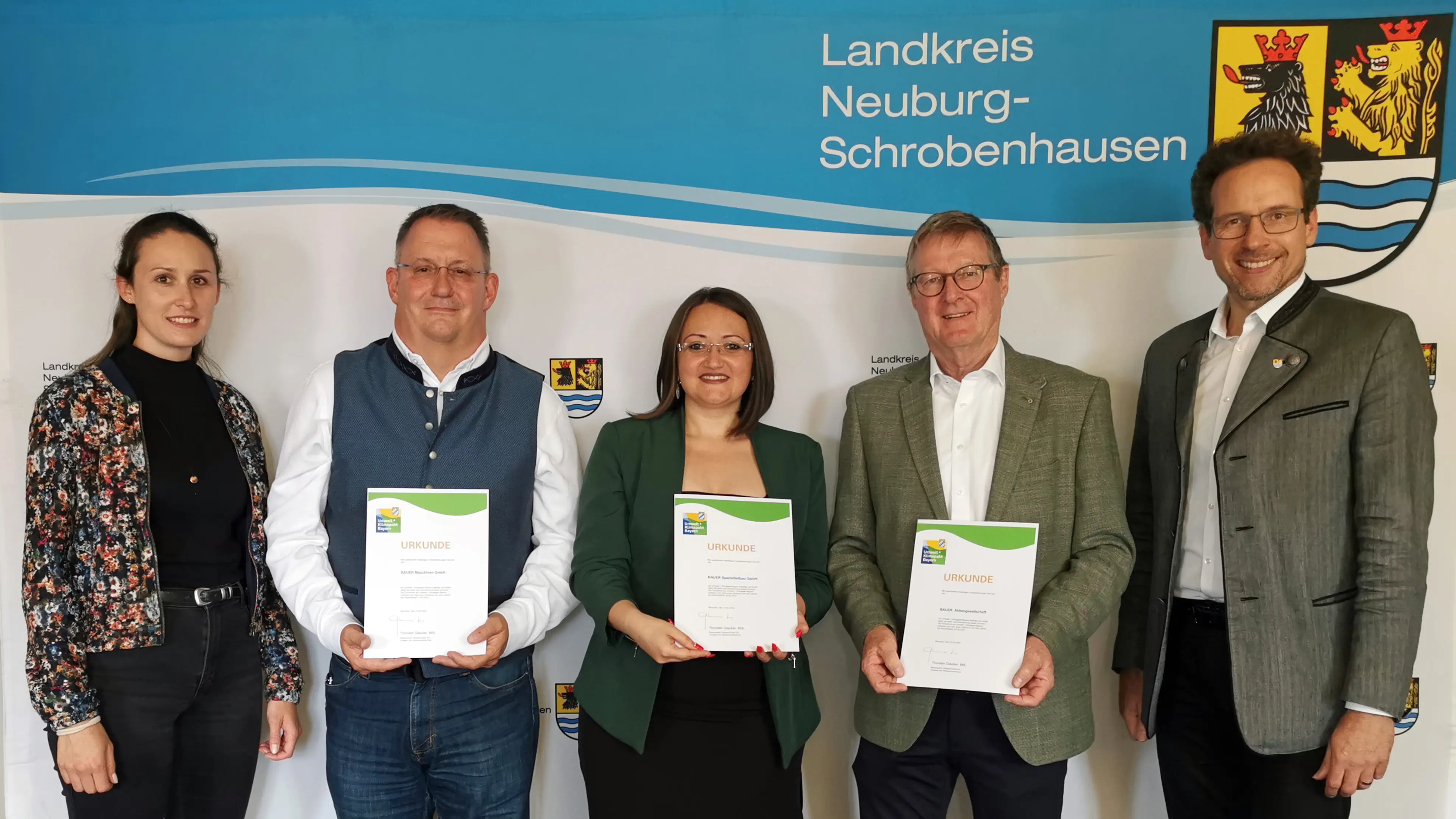 Schrobenhausen – Im Namen des Bayerischen Umweltministers Thorsten Glauber überreichte Neuburg-Schrobenhausens Landrat Peter von der Grün (links im Bild) im Juni drei Teilnehmerurkunden am Umwelt- und Klimapakt Bayern an die BAUER AG. Durch Fortführung des Umweltmanagementsystems nach EMAS leistet Bauer einen besonderen Beitrag für nachhaltiges Wirtschaftswachstum.